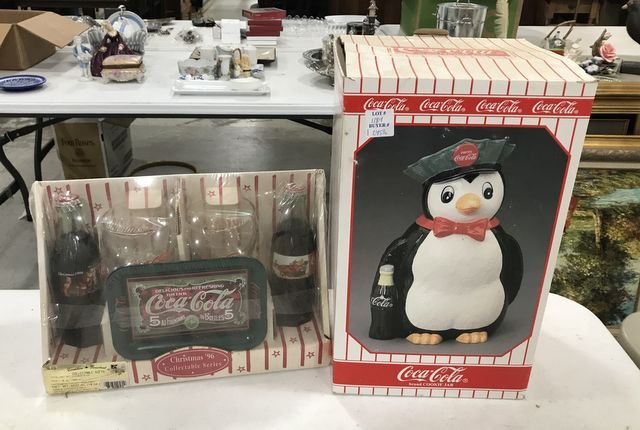 Coca Cola Penguin Cookie Jar, and Christmas 1996 Collectible series, bottles, glasses, mini tray. Coca Cola Penguin Cookie Jar, and Christmas 1996 Collectible series, bottles, glasses, mini tray.