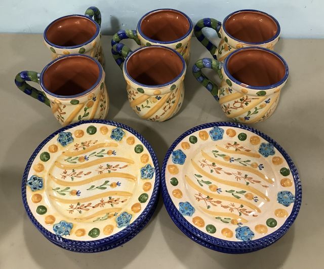 World Bazars Hand Painted Pottery Plates and Mugs, 6 mugs, 6 plates, good condition. World Bazars Hand Painted Pottery Plates and Mugs, 6 mugs, 6 plates, good condition.