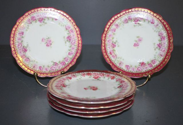 Porcelain Vase, Plates and Pitcher Late 19th century hand painted vase with cherubs 10"h., Lenox autumn pattern pitcher, set of six Austrian 6" plates. Porcelain Vase, Plates and Pitcher Late 19th century hand painted vase with cherubs 10"h., Lenox autumn pattern pitcher, set of six Austrian 6" plates.