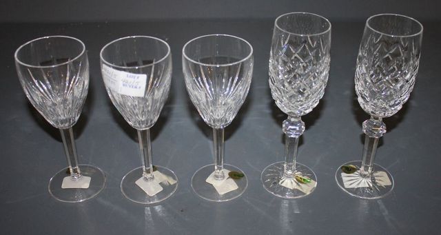 366 Five Waterford Glasses Three carina claret 7"h., two powers court flutes 8"h.