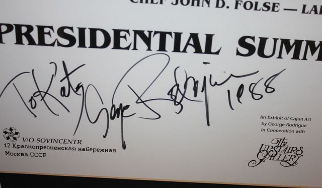 1988 Poster of "A Cajun Chef in Moscow" Presidential Summit in Moscow., Poster of Chef John D. Folse, signed by Rodrigue as gift in 1988, 26"w., 38"h. 1988 Poster of "A Cajun Chef in Moscow" Presidential Summit in Moscow., Poster of Chef John D. Folse, signed by Rodrigue as gift in 1988, 26"w., 38"h.