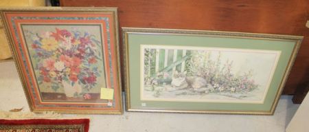 452 Larry Barnard Floral Print and Print of Cat by Jodi Jensen Larry Barnard Floral Print 24"w., 28"h. and Print of Cat by Jodi Jensen 39"w., 23"h.