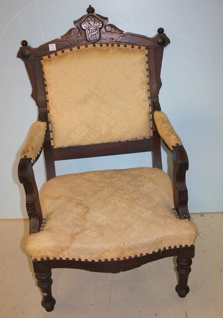 Walnut Victorian Arm Chair upholstery has stains, matches lot # 508; 38" h. Walnut Victorian Arm Chair upholstery has stains, matches lot # 508; 38" h.