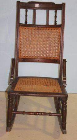 526 Walnut East Lake Sewing Rocker has cane seat and back; seat has a hole in the cane; 34" h.