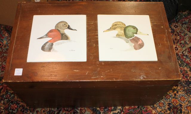 Wooden Box with Inserted Duck Tiles contains CDs and VHS movies; 24" w. x 14" h. Wooden Box with Inserted Duck Tiles contains CDs and VHS movies; 24" w. x 14" h.
