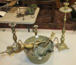 Group of Brass including 12" dia. Pail, 13" h. andirons, candlesticks Group of Brass including 12" dia. Pail, 13" h. andirons, candlesticks