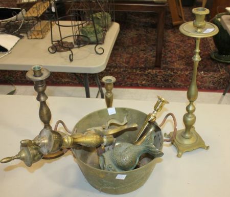 573 Group of Brass including 12" dia. Pail, 13" h. andirons, candlesticks