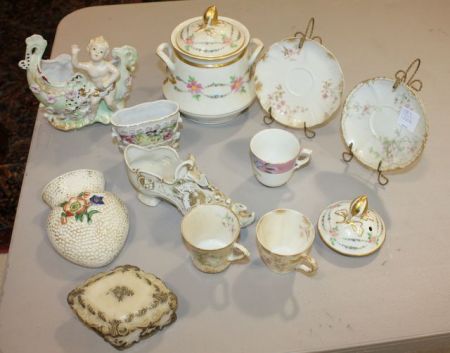 Two Cups and Saucers, Porcelain Shoe, Wall Pocket, Covered Sugar, Vase, and Covered Jar Two Cups and Saucers, Porcelain Shoe, Wall Pocket, Covered Sugar, Vase, and Covered Jar Two Cups and Saucers, Porcelain Shoe, Wall Pocket, Covered Sugar, Vase, and Covered Jar Two Cups and Saucers, Porcelain Shoe, Wall Pocket, Covered Sugar, Vase, and Covered Jar
