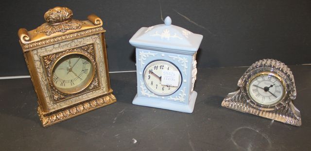 595 Three Small Clocks, Crystal Clock, Blue Porcelain Clock, and Gold Clock crystal clock 3 1/2" h, porcelain clock 6" h., gold clock 7" h.