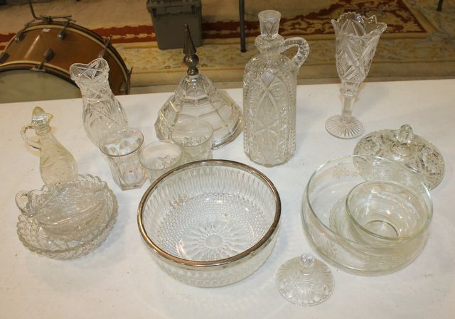 Glass Lot including bowls, cruet, vases, lids, Heisey triangular dish Glass Lot including bowls, cruet, vases, lids, Heisey triangular dish
