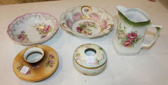 607 Porcelain Bowls, Pitcher, Hair Receiver some cracks