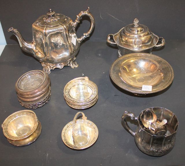 611 Shaw and Fish Sheffield Teapot, Quadruple Plate Butter Dish, Plate, Cup, Compote, Salt Cellar, Hanging Baskets, Coasters, Spoons Shaw and Fish Sheffield Teapot, Quadruple Plate Butter Dish, Plate, Cup, Compote, Salt Cellar, Hanging Baskets, Coas