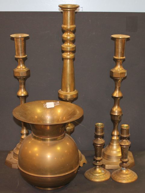 637 Brass Spittoon and Brass Candlesticks 8" - 23 1/2" h.