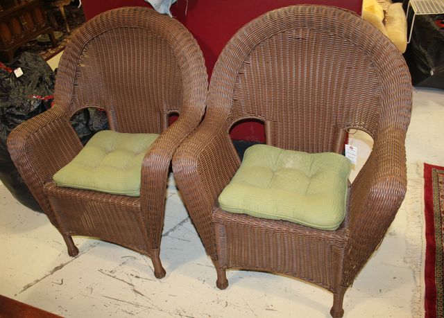 Two Brown Wicker Arm Chairs 29" w., 20" d., 37" h. Two Brown Wicker Arm Chairs 29" w., 20" d., 37" h.