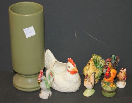 684 Pottery Vase, Group of Roosters Porcelain Plates, Bowls, and Candlestick
