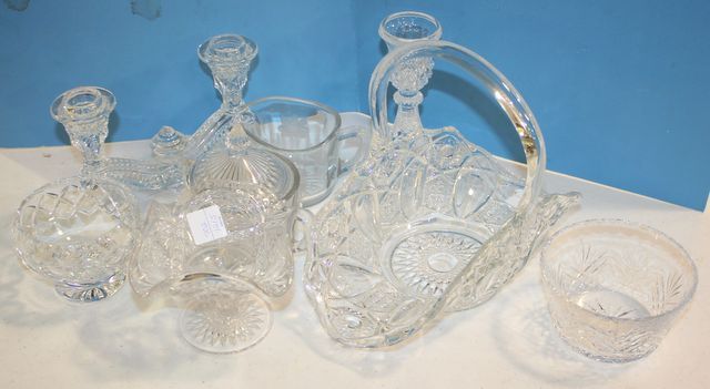 702 Group of Glass consisting of basket, small bowl, two candlesticks, creamer, covered sugar, dish and compote