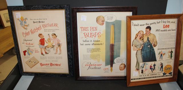 Three Framed Advertising Prints 1947 Lee Jeans, 1953 Eversharp Pens, and 1950s Buster Brown Three Framed Advertising Prints 1947 Lee Jeans, 1953 Eversharp Pens, and 1950s Buster Brown