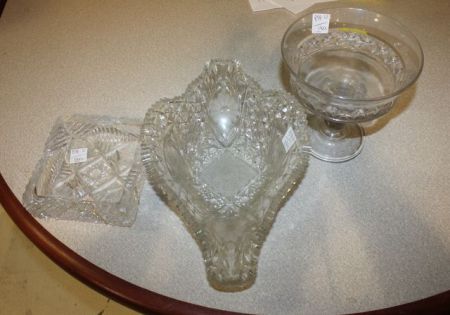 898 Early Glass Lot Early glass lot consisting of cut glass basket/boat 14"w., cut glass square ashtray 6", press glass compote 6"dia.