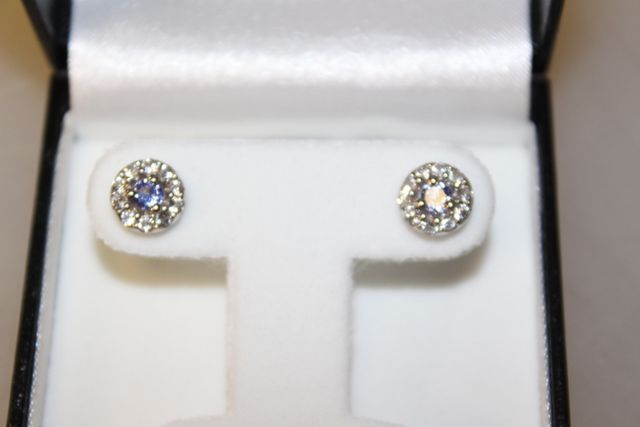 Tanzanite earrings in box. Tanzanite earrings in box.