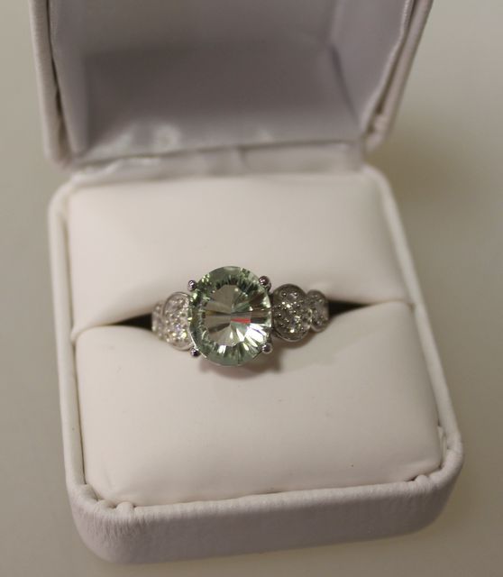 4ct green sapphire ring in box. 4ct green sapphire ring in box.