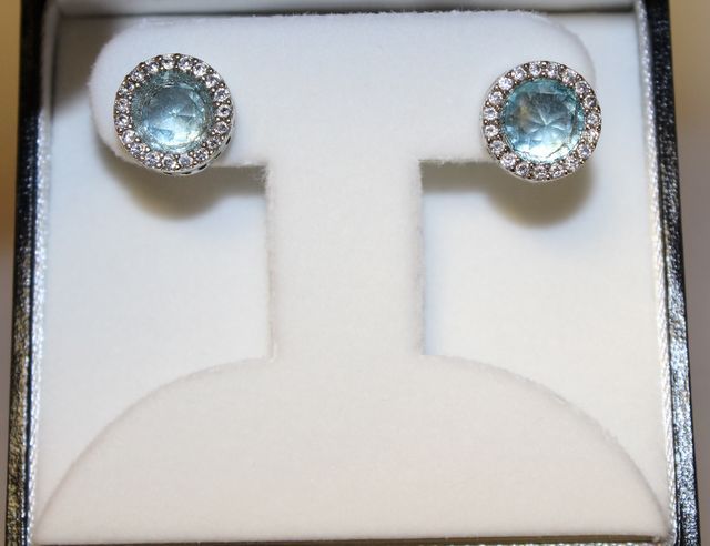 Blue topaz earrings in box. Blue topaz earrings in box.