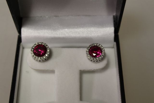 Large ruby earrings in box. Large ruby earrings in box.