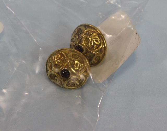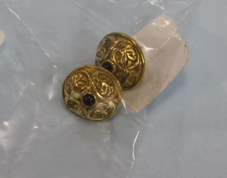 Pair of etruscean style earrings with red stones. Pair of etruscean style earrings with red stones.