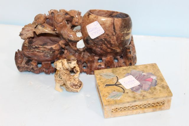 Soapstone carving of monkey with pots. 8 1/2"w x 3 3/4"h. Inlaid box and small fisherman, 2 1/4"h. Soapstone carving of monkey with pots. 8 1/2"w x 3 3/4"h. Inlaid box and small fisherman, 2 1/4"h.