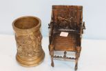 Pair of bronze items. Chair is 7" high. Brush pot is 5 1/2" h. Pair of bronze items. Chair is 7" high. Brush pot is 5 1/2" h.