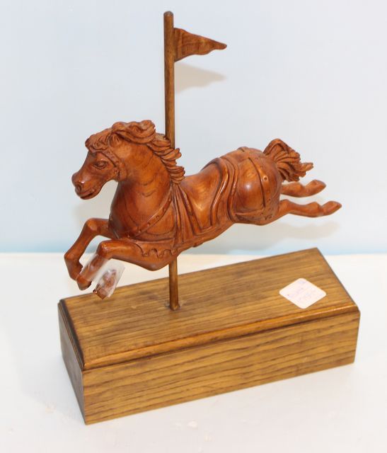 Carousel horse hand carved by Tom Cochran. 11 1/2" h. One leg has been broken but piece is present. Carousel horse hand carved by Tom Cochran. 11 1/2" h. One leg has been broken but piece is present.