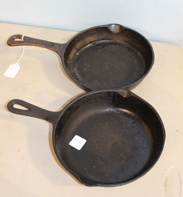 8" diameter pair of cast iron skillets. One is marked Benjamin & Medwin. 8" diameter pair of cast iron skillets. One is marked Benjamin & Medwin.