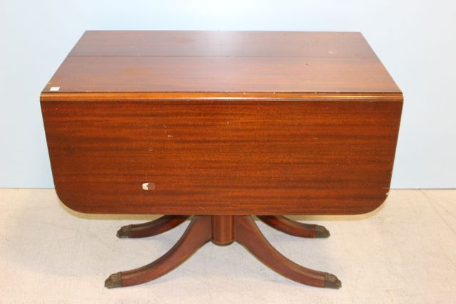 Drop leaf table with three leaves. Three pedestals with two paw feet each. 42" w x 25" l (with leaves down) x 30"h. Drop leaf table with three leaves. Three pedestals with two paw feet each. 42" w x 25" l (with leaves down) x 30"h.