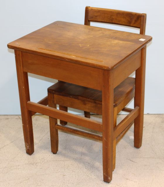 Small child's desk with chair. Desk measures, 24"w x 18"d x 27"h. Chair is 16"w x 15 1/2"d x 29 1/2"h. Seat is 16"h. Small child's desk with chair. Desk measures, 24"w x 18"d x 27"h. Chair is 16"w x 15 1/2"d x 29 1/2"h. Seat is 16"h.