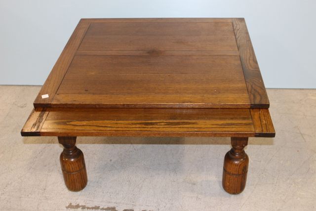 Oak pub table cut down to coffee table height. With two pop up leaves. Measures 35 1/2"w x 35 1/2"d x 19"h. Measured without leaves. Oak pub table cut down to coffee table height. With two pop up leaves. Measures 35 1/2"w x 35 1/2"d x 19"h. Measured without leaves.