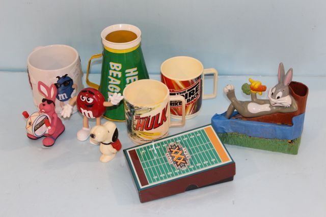 Merchandising advertising lot. Includes movie items, Warner Bros. items, M & M's, Snoopy, and football items. Eight pieces in total. Merchandising advertising lot. Includes movie items, Warner Bros. items, M & M's, Snoopy, and football items. Eight pieces in total.