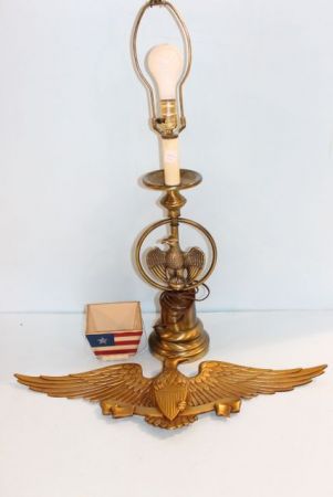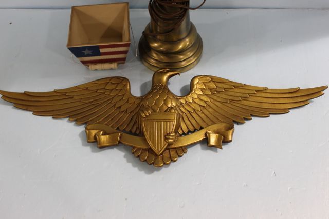 Flag decorated pail, Eagle lamp and metal eagle plaque. Flag decorated pail, Eagle lamp and metal eagle plaque.