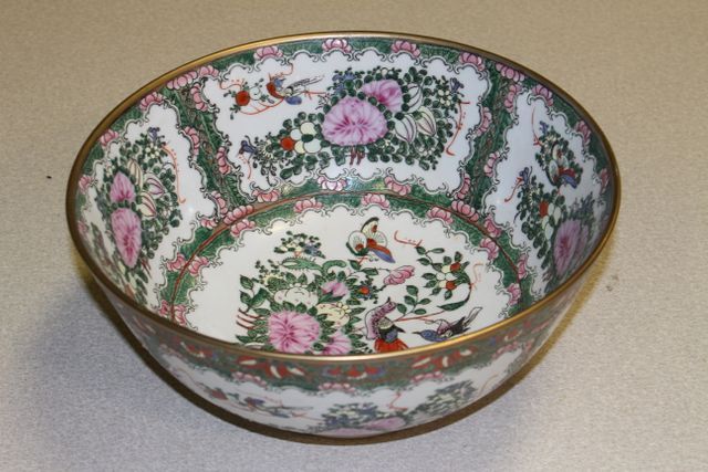 Rose medallion style bowl by Andrea by Sadek. 12"w x 6"h. Rose medallion style bowl by Andrea by Sadek. 12"w x 6"h.