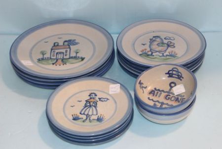 Fourteen pieces of M A Hadley pottery including four dinner plates, four luncheon plates, four salad plates, and two bowls. Has utensil wear. Fourteen pieces of M A Hadley pottery including four dinner plates, four luncheon plates, four salad plates, and two bowls. Has utensil wear.