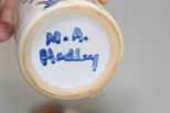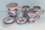 Three mugs, pitcher, valentine trinket dish, dish with lid (chipped). Three mugs, pitcher, valentine trinket dish, dish with lid (chipped).