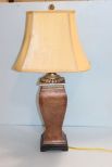 Silver and brown textured body lamp with silk shade. Silver and brown textured body lamp with silk shade.