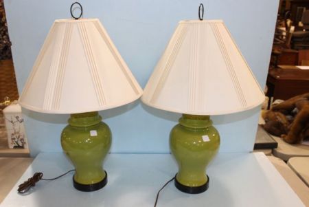 1022 Pair of Green Ceramic Lamps with Shades