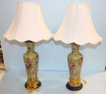 Green base lamps with a pink floral design. Measures 30"h. Green base lamps with a pink floral design. Measures 30"h.