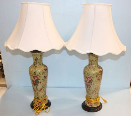 1106 Pair of Green Floral Lamps with Shades