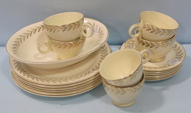 Knowles gold leaf patterned dishes. SIx luncheon plates, six cups, six saucers, and a serving bowl. Knowles gold leaf patterned dishes. SIx luncheon plates, six cups, six saucers, and a serving bowl.