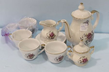 Miniature floral tea set. Has teapot, creamer sugar bowl, four cups (one handle is broken but is present), four saucers. Miniature floral tea set. Has teapot, creamer sugar bowl, four cups (one handle is broken but is present), four saucers.