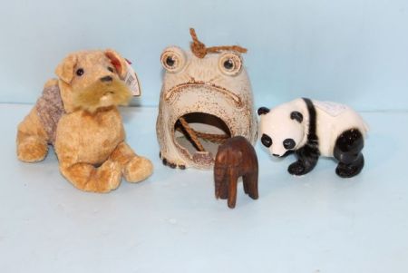 Four small animal items including Ty dog, wooden elephant, panda and frog. Four small animal items including Ty dog, wooden elephant, panda and frog.