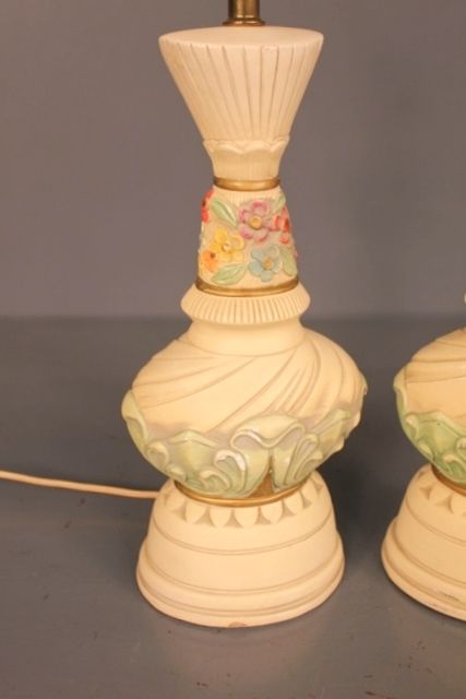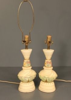 Pair of Weller Decanter Lamps 1940 gold trim and floral design; 18" h. Pair of Weller Decanter Lamps 1940 gold trim and floral design; 18" h.