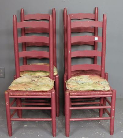 Three Maroon Ladder Back Chairs w/cushions; 42" h. Three Maroon Ladder Back Chairs w/cushions; 42" h.