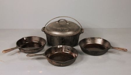 Griswold Dutch Oven and Three 8" Cast Iron Skillets Griswold Dutch Oven and Three 8" Cast Iron Skillets