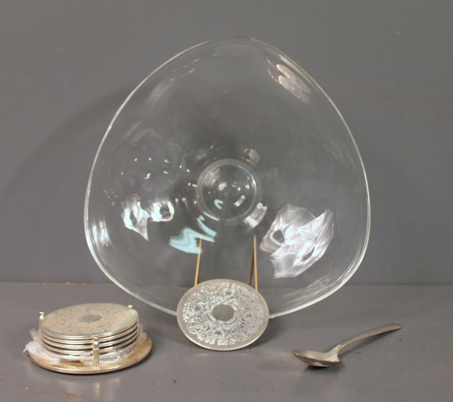 Glass Dish (12" x 11 1/2" )with Set of Coasters and Spoon Glass Dish (12" x 11 1/2" )with Set of Coasters and Spoon